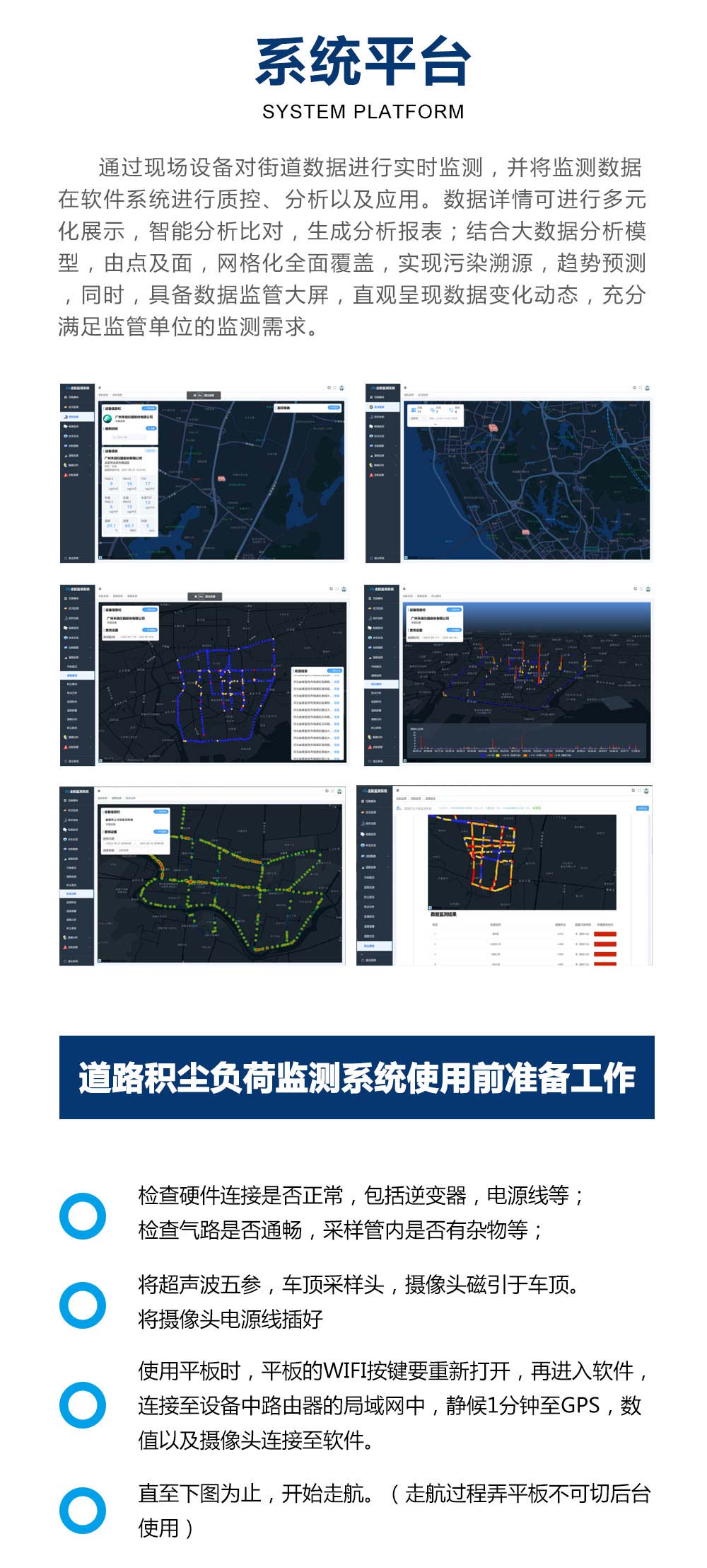 在此背景下,道路积尘负荷走航监测系统应运而生,该系统通过车载移动监测平台,结合激光雷达、传感器阵列等优良技术,实现对城市道路积尘负荷的快速、动态、全路段扫描,为城市道路扬尘精细化管控、环卫作业优化调度和空气质量改善提供科学数据支撑。
